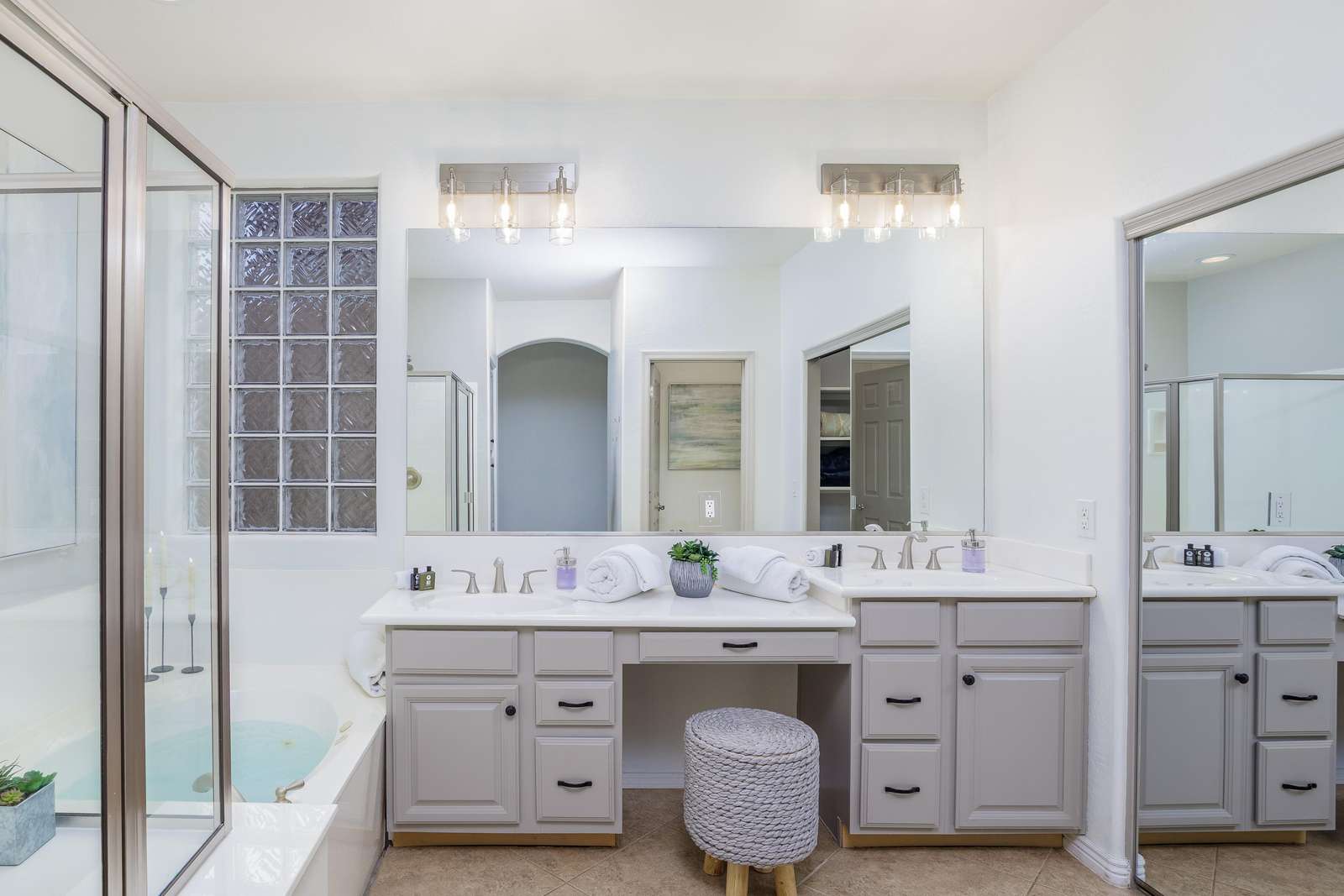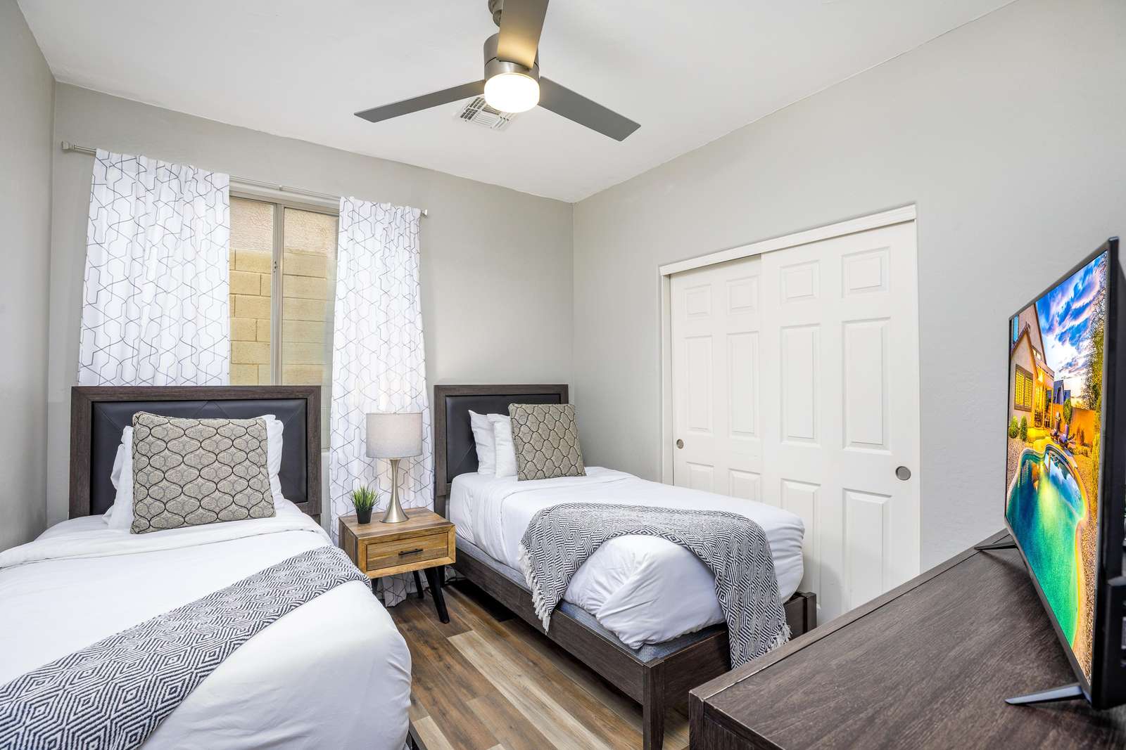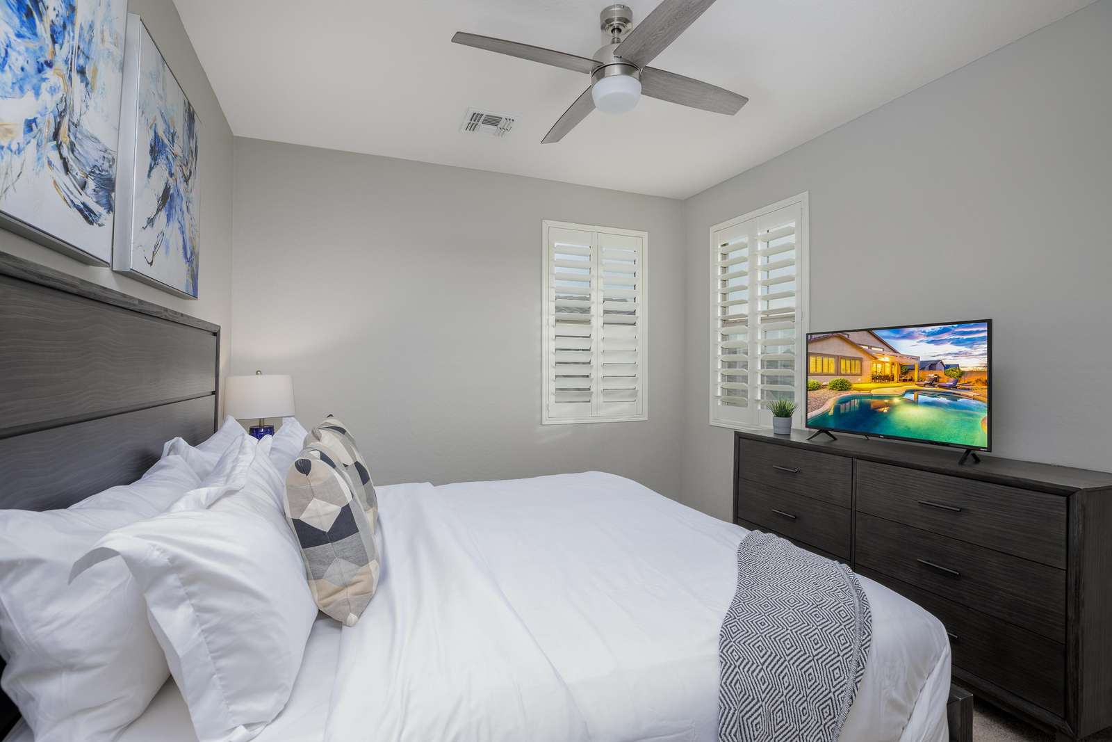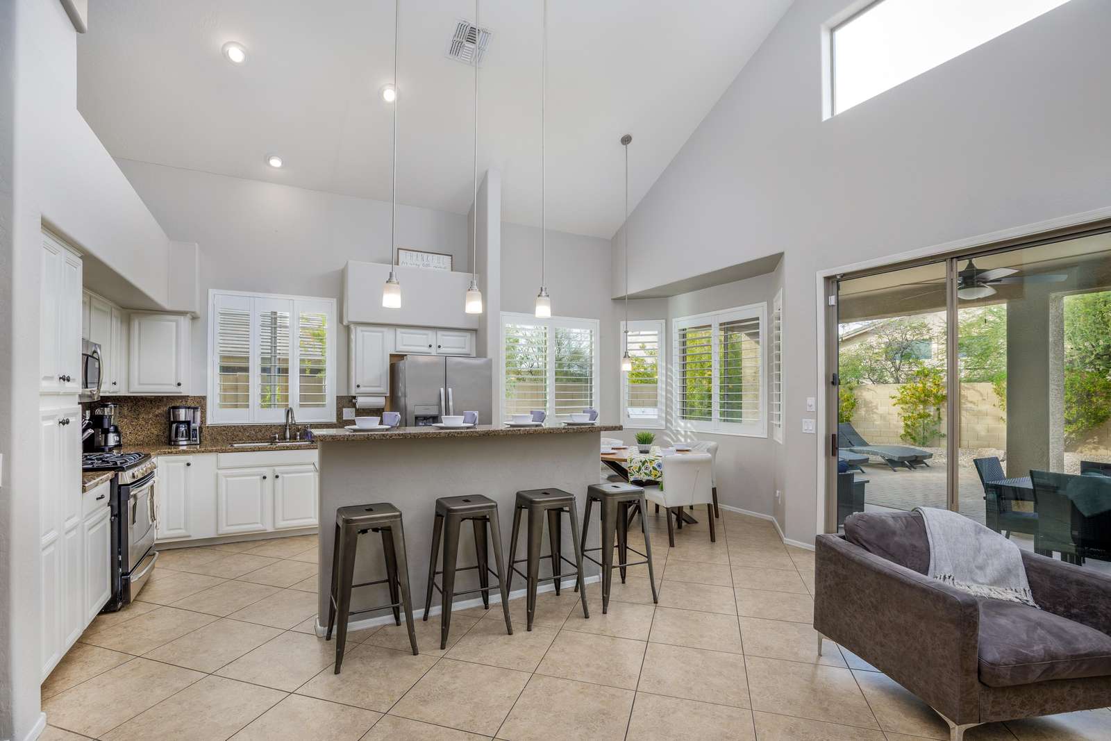 The Desert Retreat offers an open floor plan with high ceilings. The living room features a large high-definition television, patio access, plenty of seating, and a romantic fireplace. Each bedroom boasts comfortable mattresses with quality linens, high definition televisions, ample closet space, beautiful flooring, and stylish decor. The bathrooms are fully updated and crafted with quality fixtures, towels, and starter amenities kit.