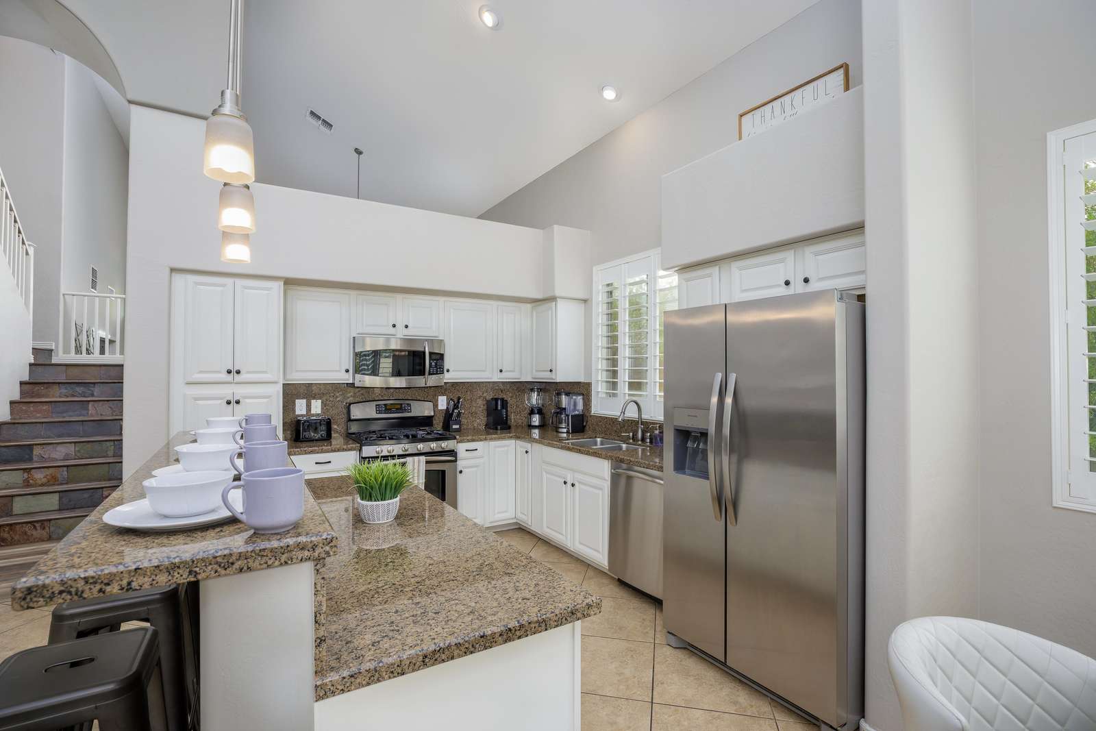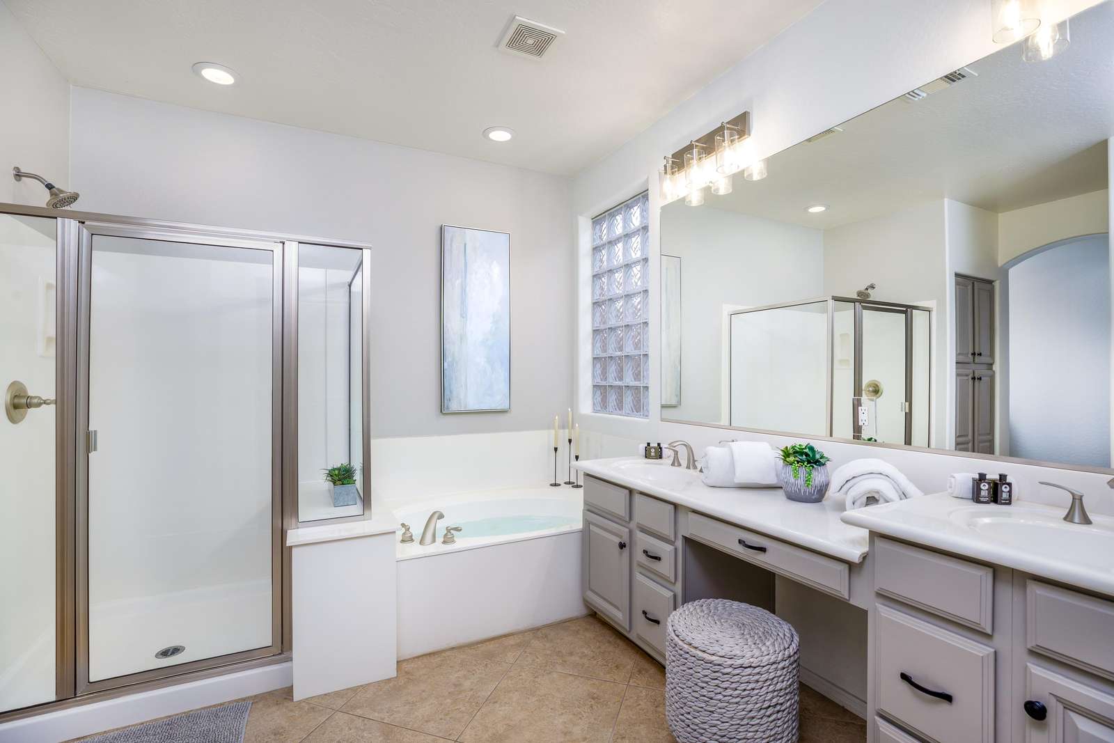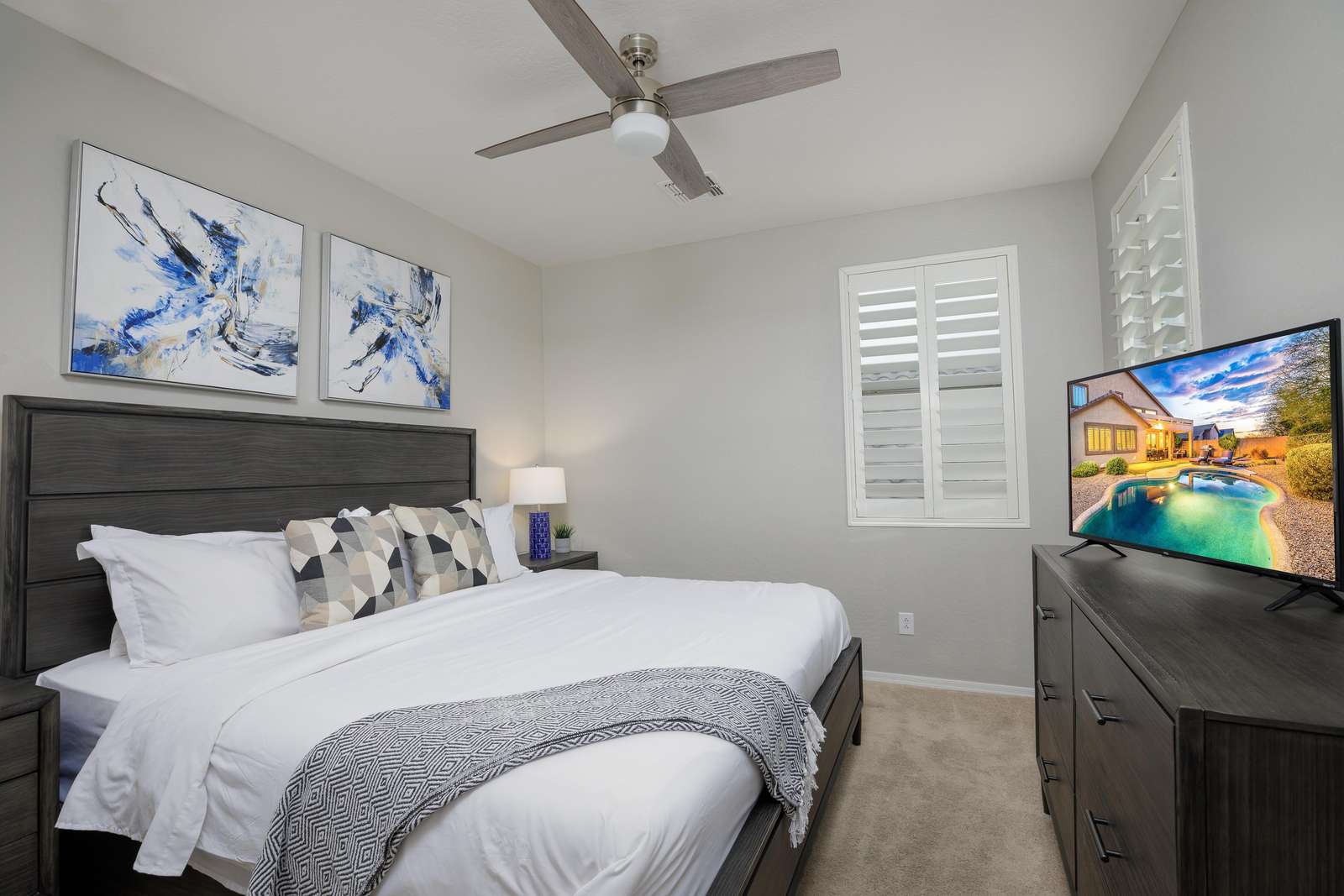 The Desert Retreat offers an open floor plan with high ceilings. The living room features a large high-definition television, patio access, plenty of seating, and a romantic fireplace. Each bedroom boasts comfortable mattresses with quality linens, high definition televisions, ample closet space, beautiful flooring, and stylish decor. The bathrooms are fully updated and crafted with quality fixtures, towels, and starter amenities kit.