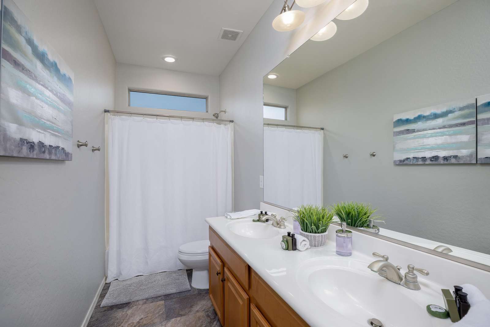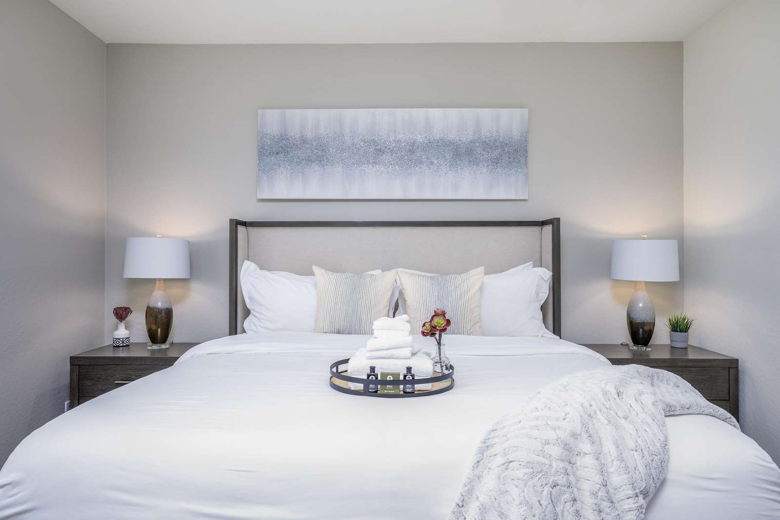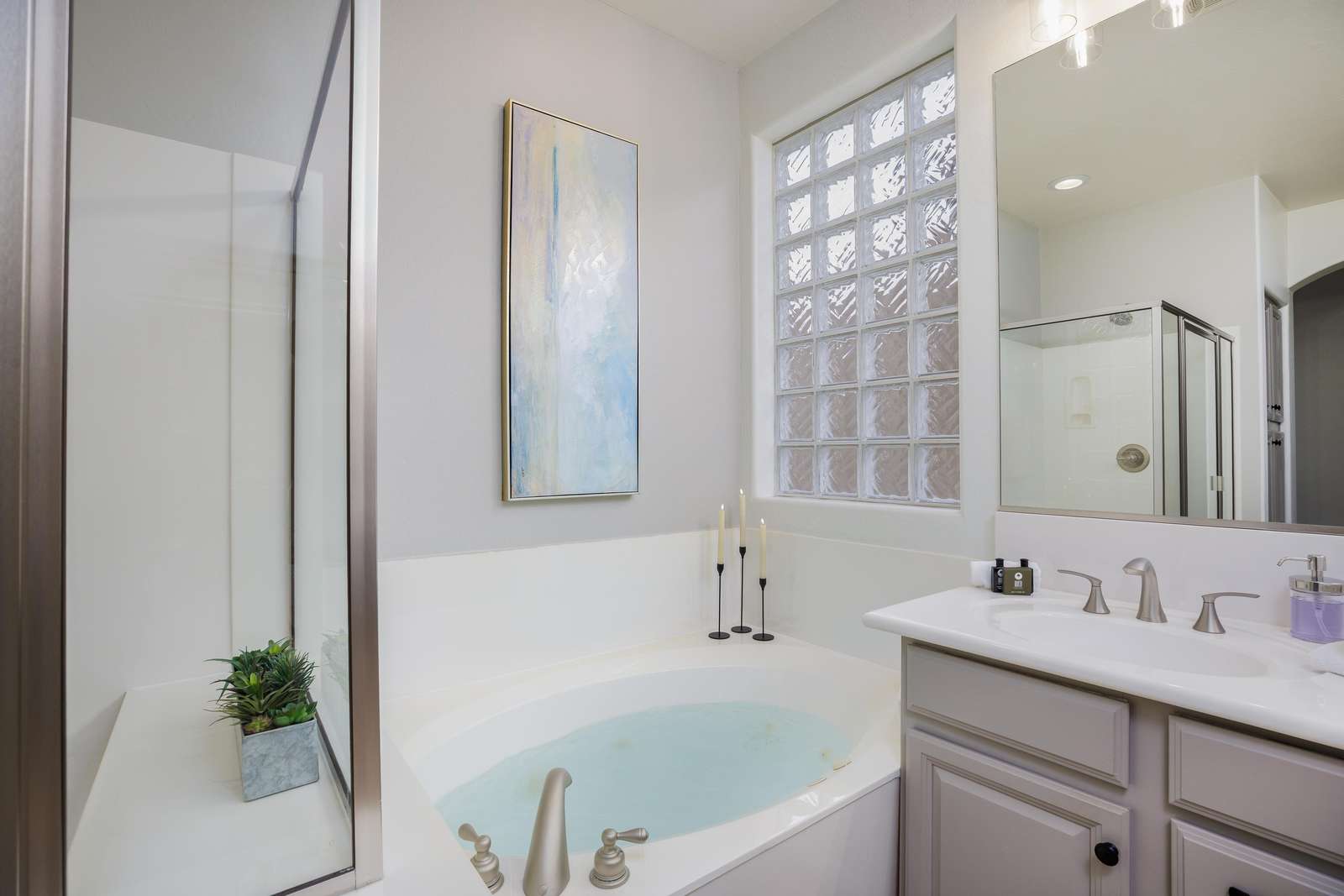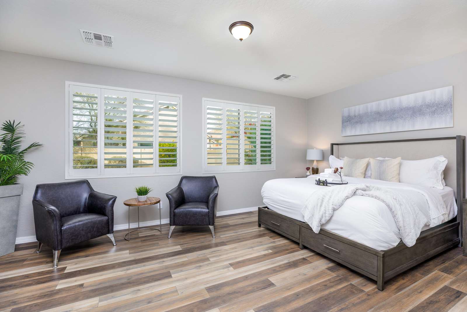 The Desert Retreat offers an open floor plan with high ceilings. The living room features a large high-definition television, patio access, plenty of seating, and a romantic fireplace. Each bedroom boasts comfortable mattresses with quality linens, high definition televisions, ample closet space, beautiful flooring, and stylish decor. The bathrooms are fully updated and crafted with quality fixtures, towels, and starter amenities kit.