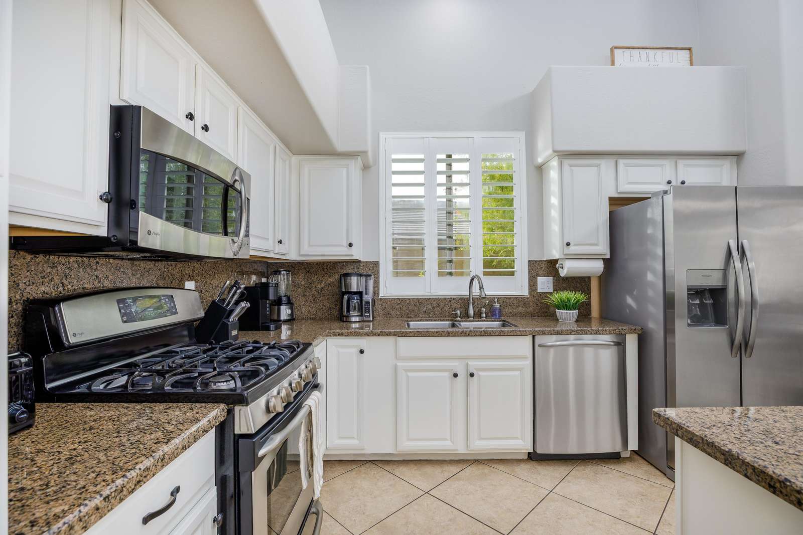 The kitchen is fully updated with beautiful granite counters and solid wood cabinets. All dining and cooking utensils are provided – making it a breeze to cook up a home cooked meal!