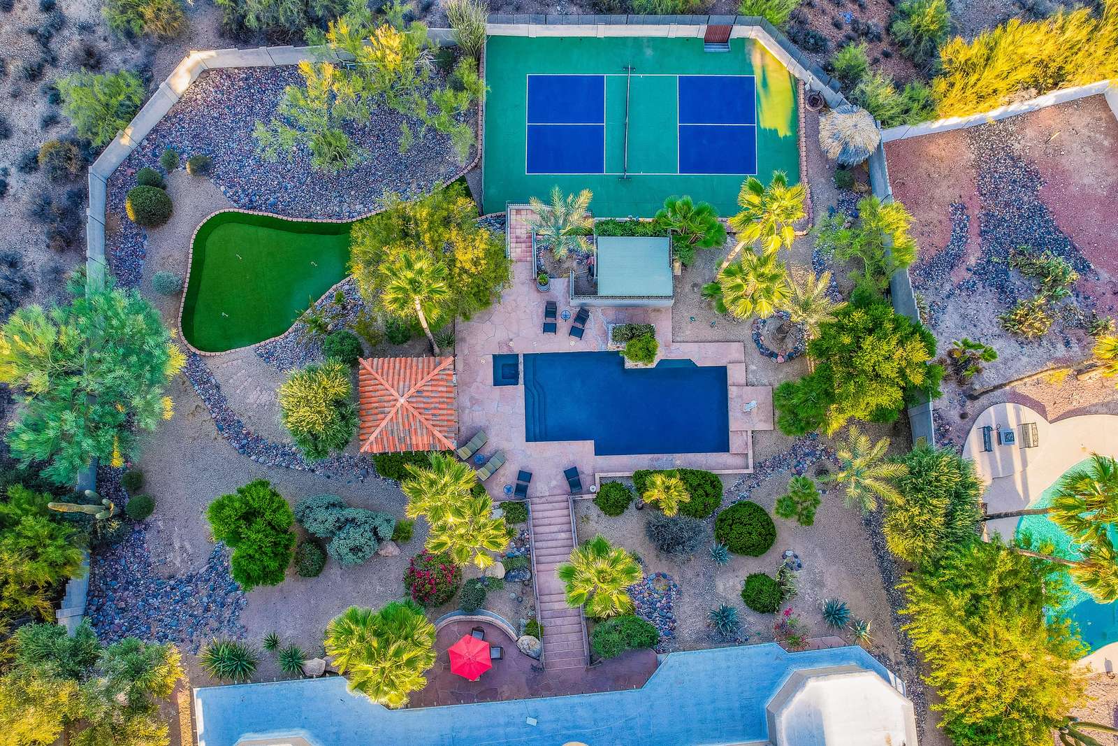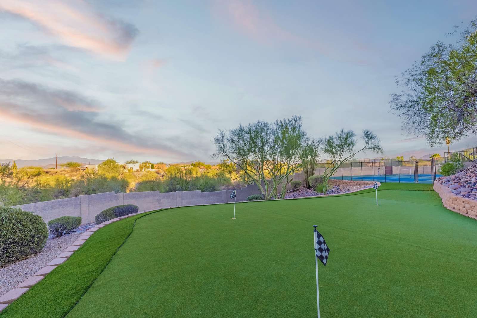 The Fountain Hills Estate offers a resort-style outdoor experience with a private pool, relaxing hot tub, private Pickleball court, outdoor putting green, and breathtaking mountain views. Whether you’re planning a family getaway, golf retreat, or desert adventure, this home delivers space, fun, and tranquility.