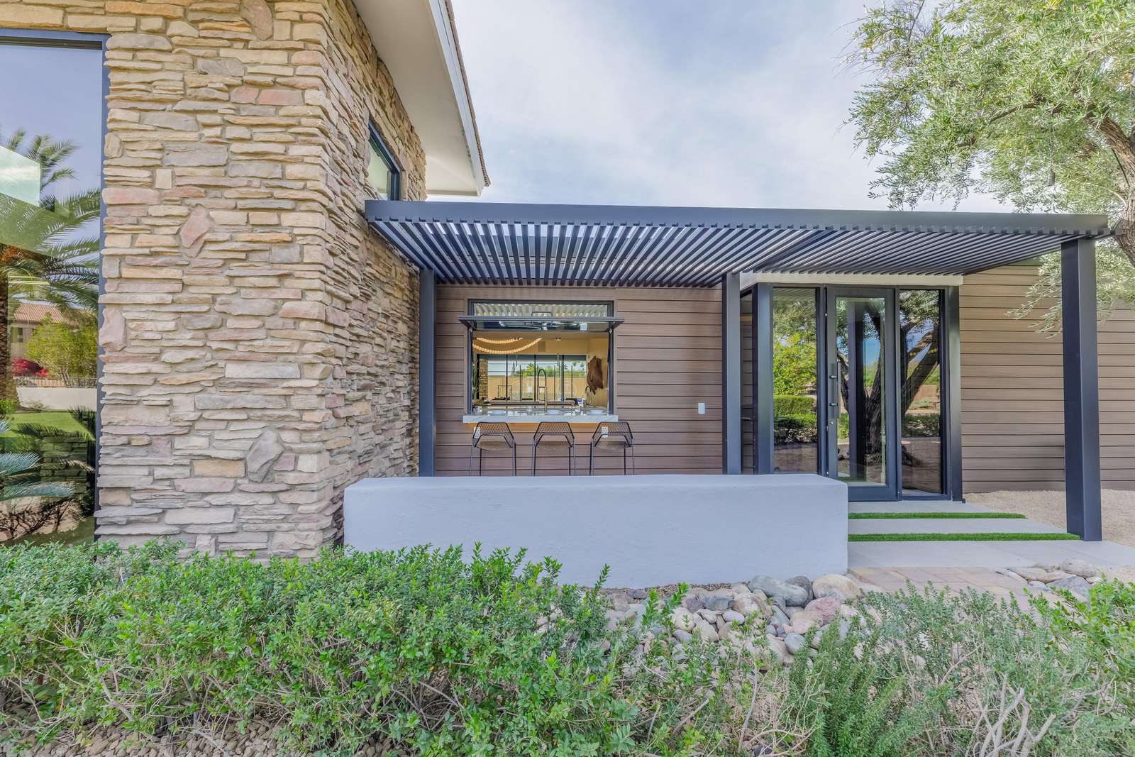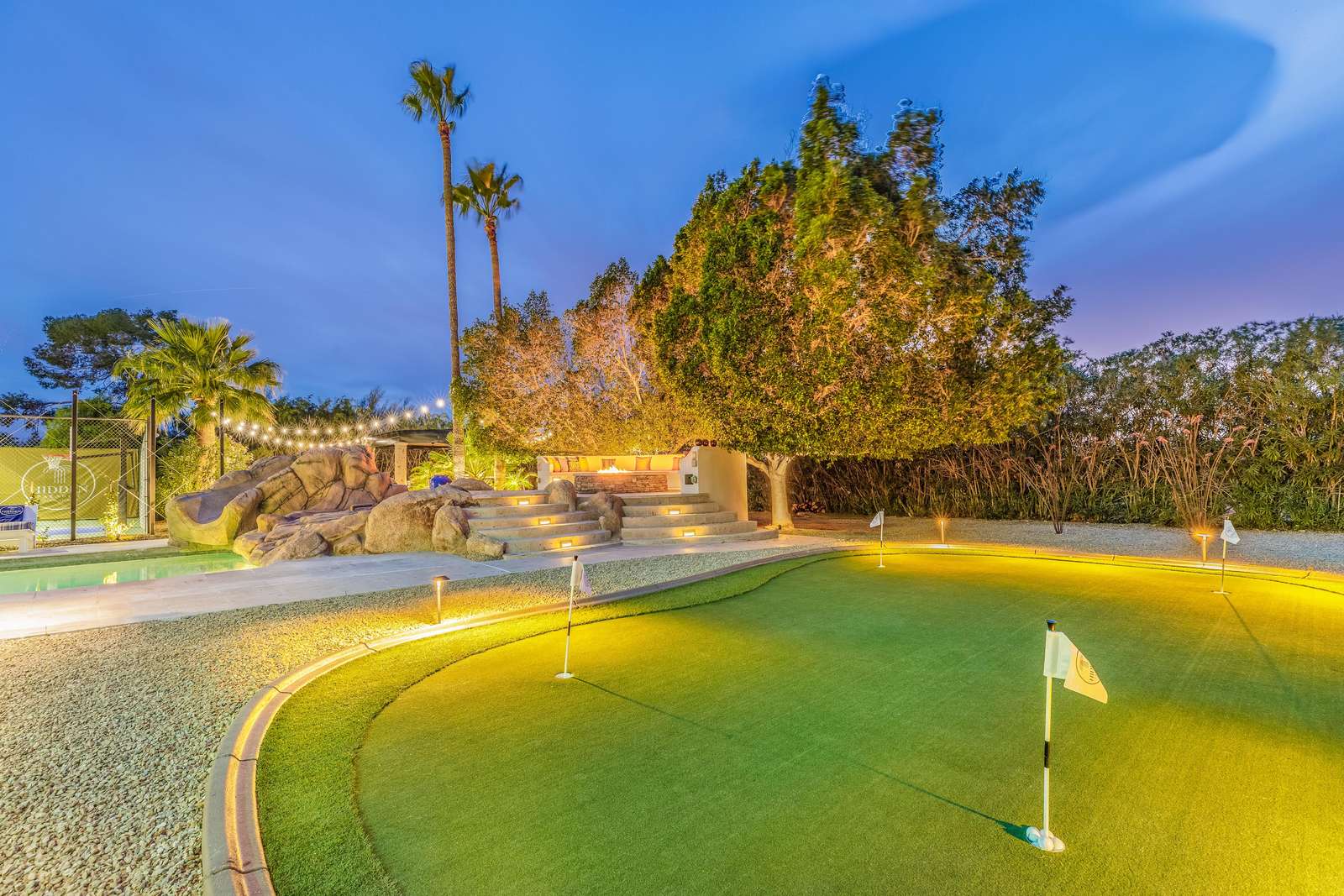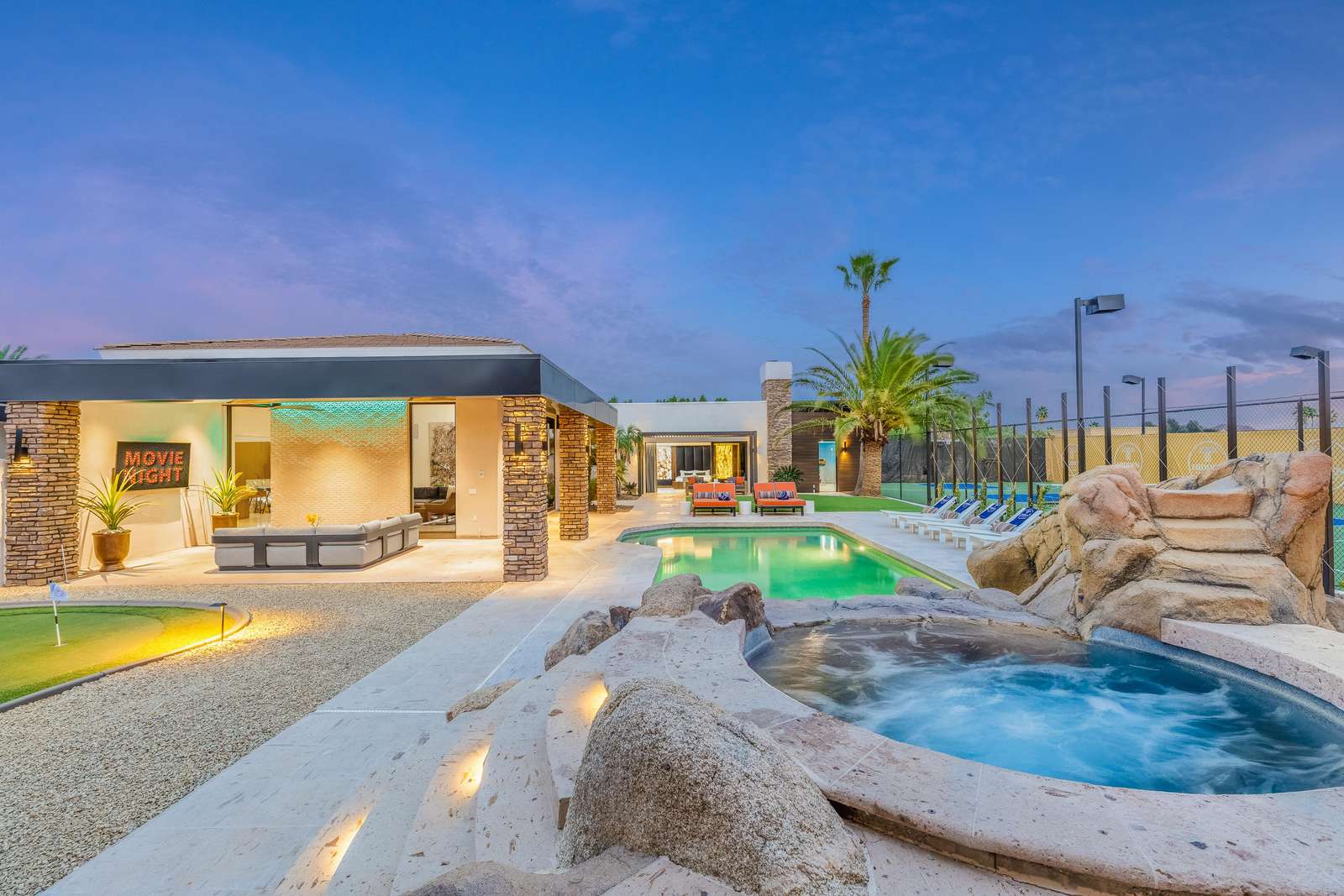 The estate's exterior offers the ultimate in luxury resort-style living, surrounded by the serene beauty of the Sonoran Desert and Mountain Views. Enjoy a swim in the expansive heated pool, complete with a fun water slide, or relax in the large spa. Dine outside under the private ramada with a built-in barbecue, have an outdoor movie night with the large patio television, challenge friends to outdoor games like corn hole, perfect your putting skills on the green, or unwind on plush outdoor lounges while soaking in the Arizona sunshine.