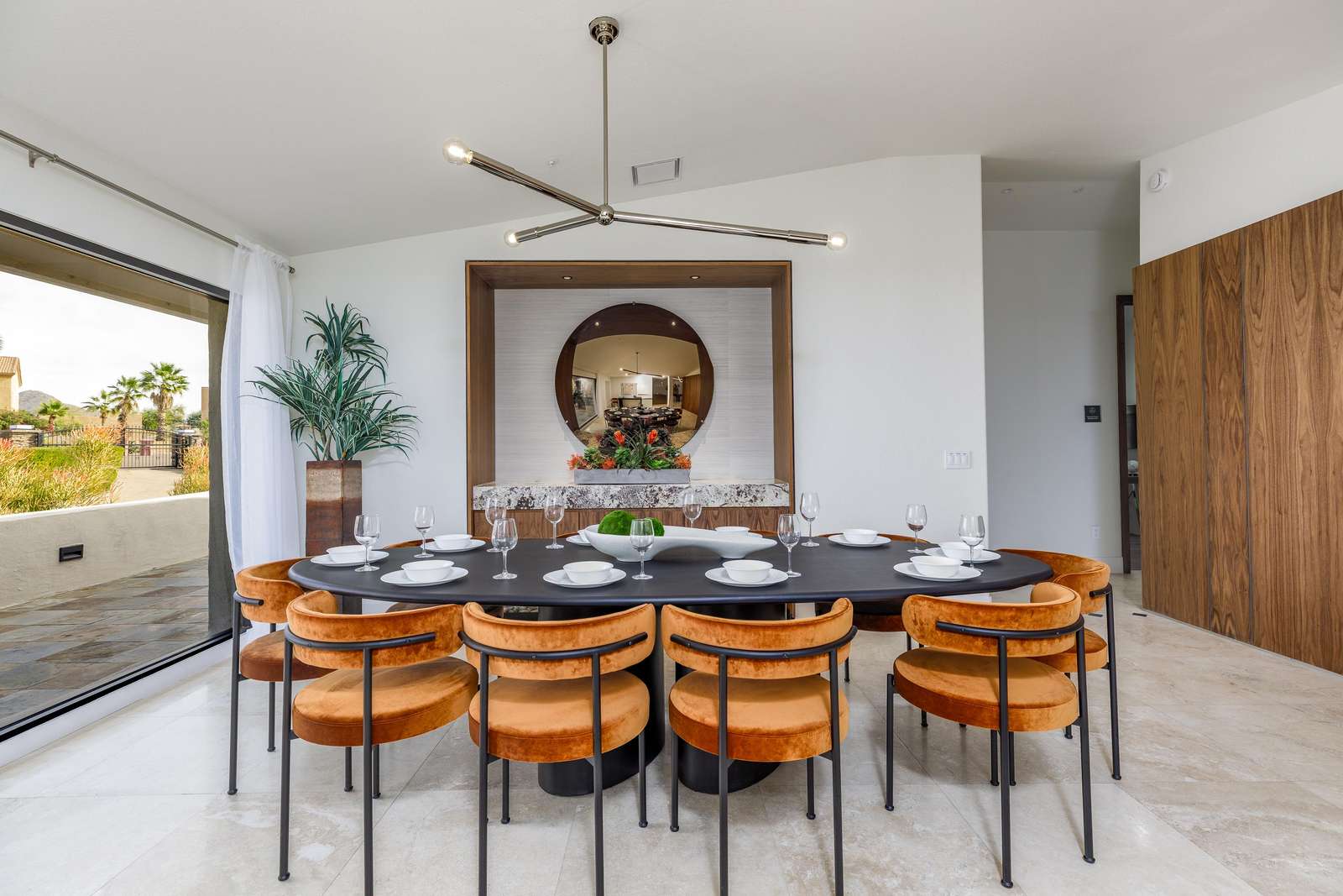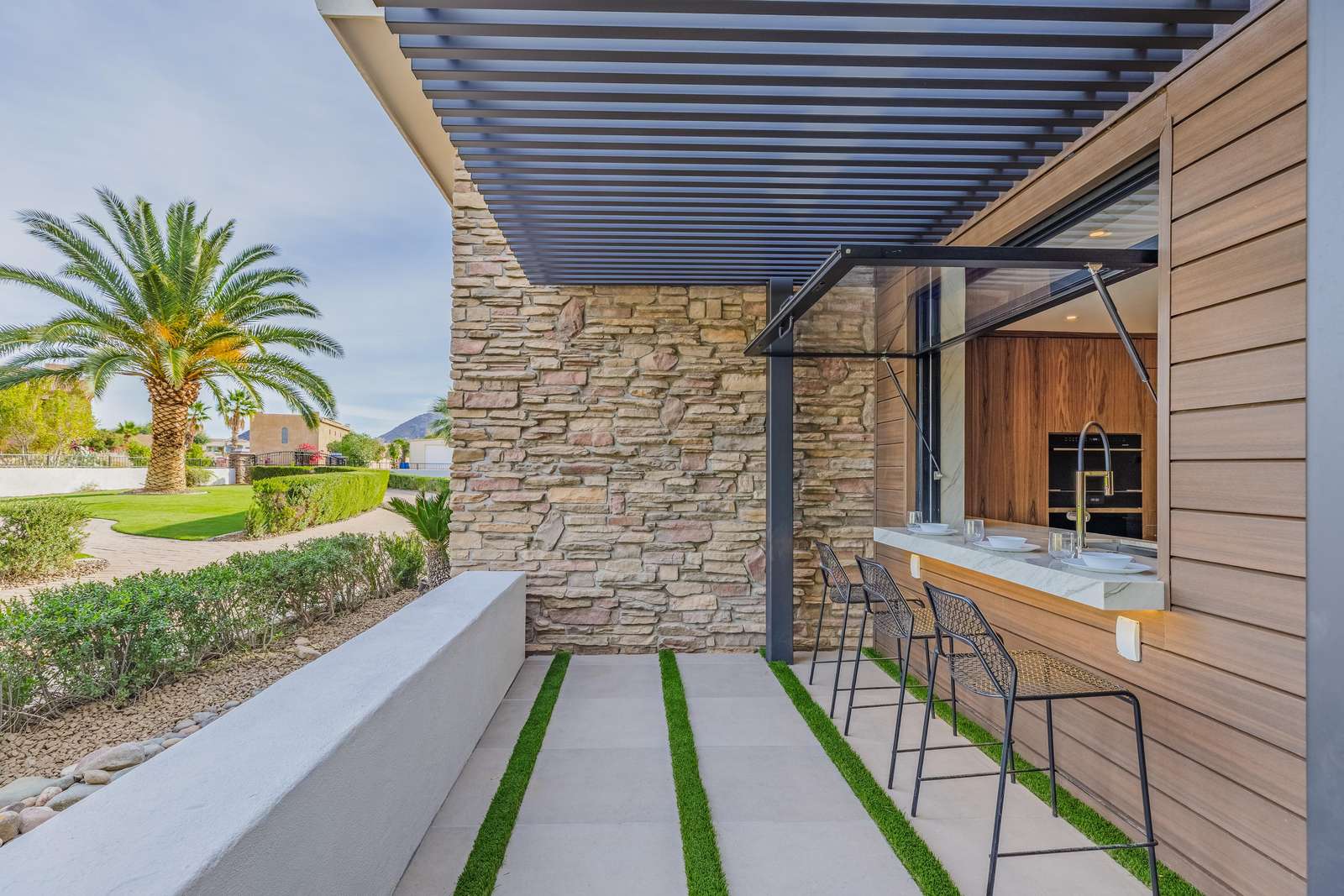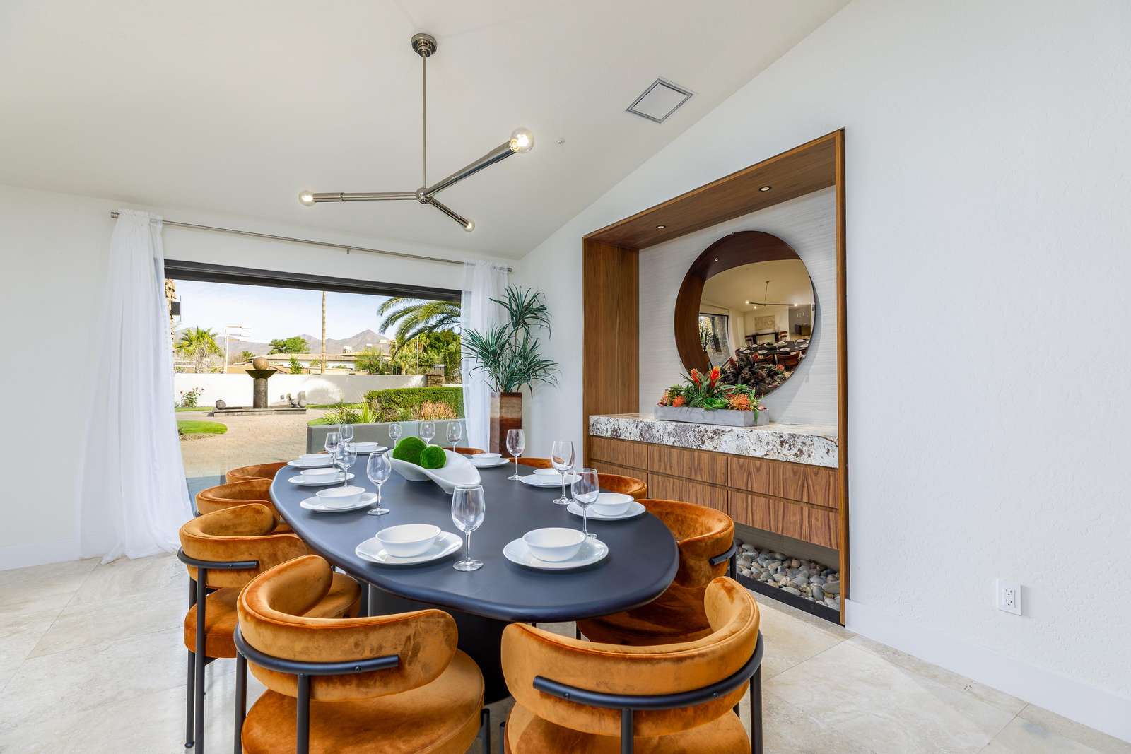The estate's exterior offers the ultimate in luxury resort-style living, surrounded by the serene beauty of the Sonoran Desert and Mountain Views. Enjoy a swim in the expansive heated pool, complete with a fun water slide, or relax in the large spa. Dine outside under the private ramada with a built-in barbecue, have an outdoor movie night with the large patio television, challenge friends to outdoor games like corn hole, perfect your putting skills on the green, or unwind on plush outdoor lounges while soaking in the Arizona sunshine.