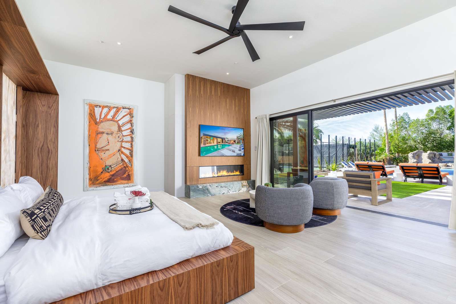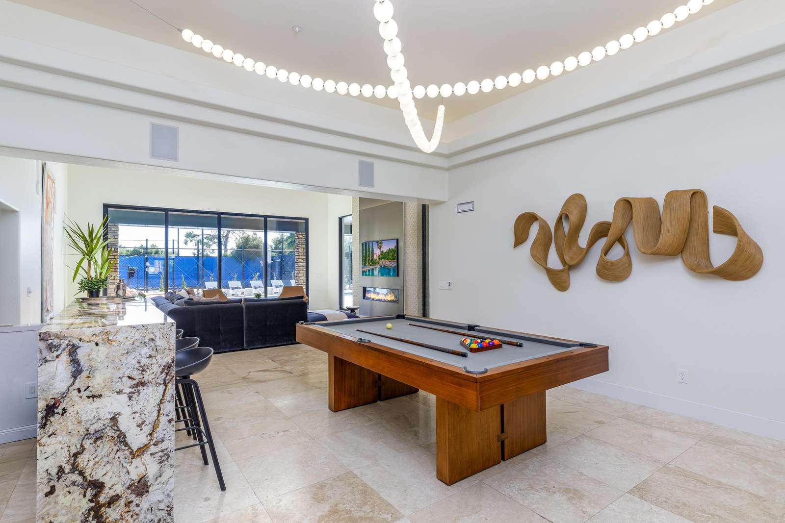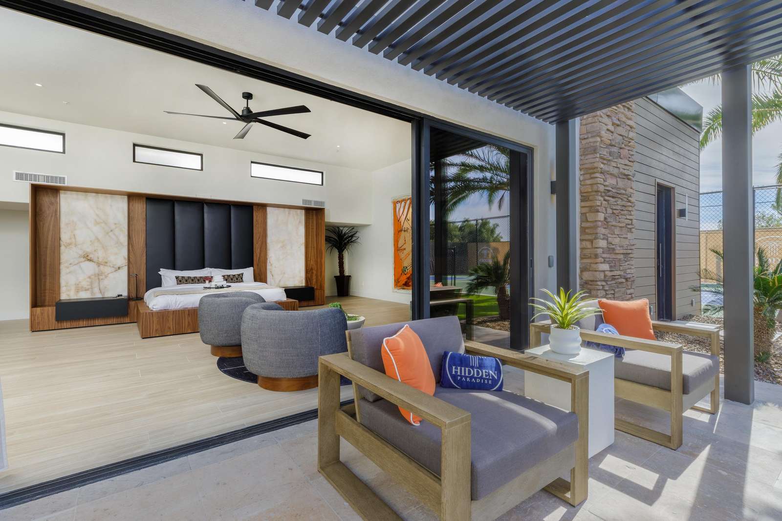 This property has been fully renovated and completed in January 2026. Step into Hidden Paradise and discover a bright, airy floor plan crafted for ultimate comfort and entertainment. At the heart of the home lies a modern kitchen, showcasing stunning countertops, custom walnut cabinetry, and Viking appliances - perfect for preparing delicious meals. Adjacent, a spacious dining room invites you to gather and savor memorable meals together. Each of the six uniquely themed bedrooms is a sanctuary of relaxation, featuring cozy bedding, TVs, ample storage, and direct access to peaceful courtyards. The owner's suite has been updated with 200K worth of finishes and a custom-made king-sized bed. The fun continues in the vibrant game room, board games, complete with a pool table, and a glowing wet bar, ensuring endless entertainment for your group!